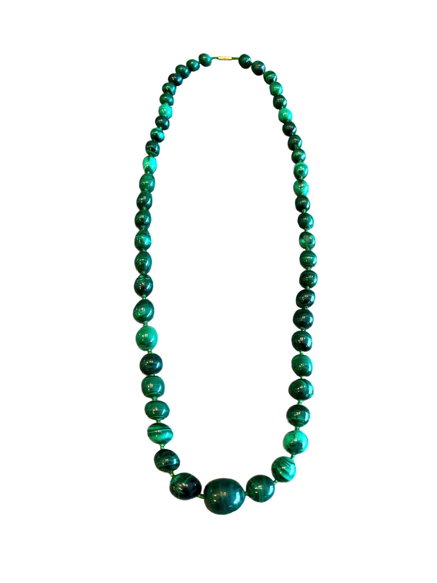 Adorn yourself with the captivating beauty of our long malachite necklace, featuring stones that gracefully transition from small to large.