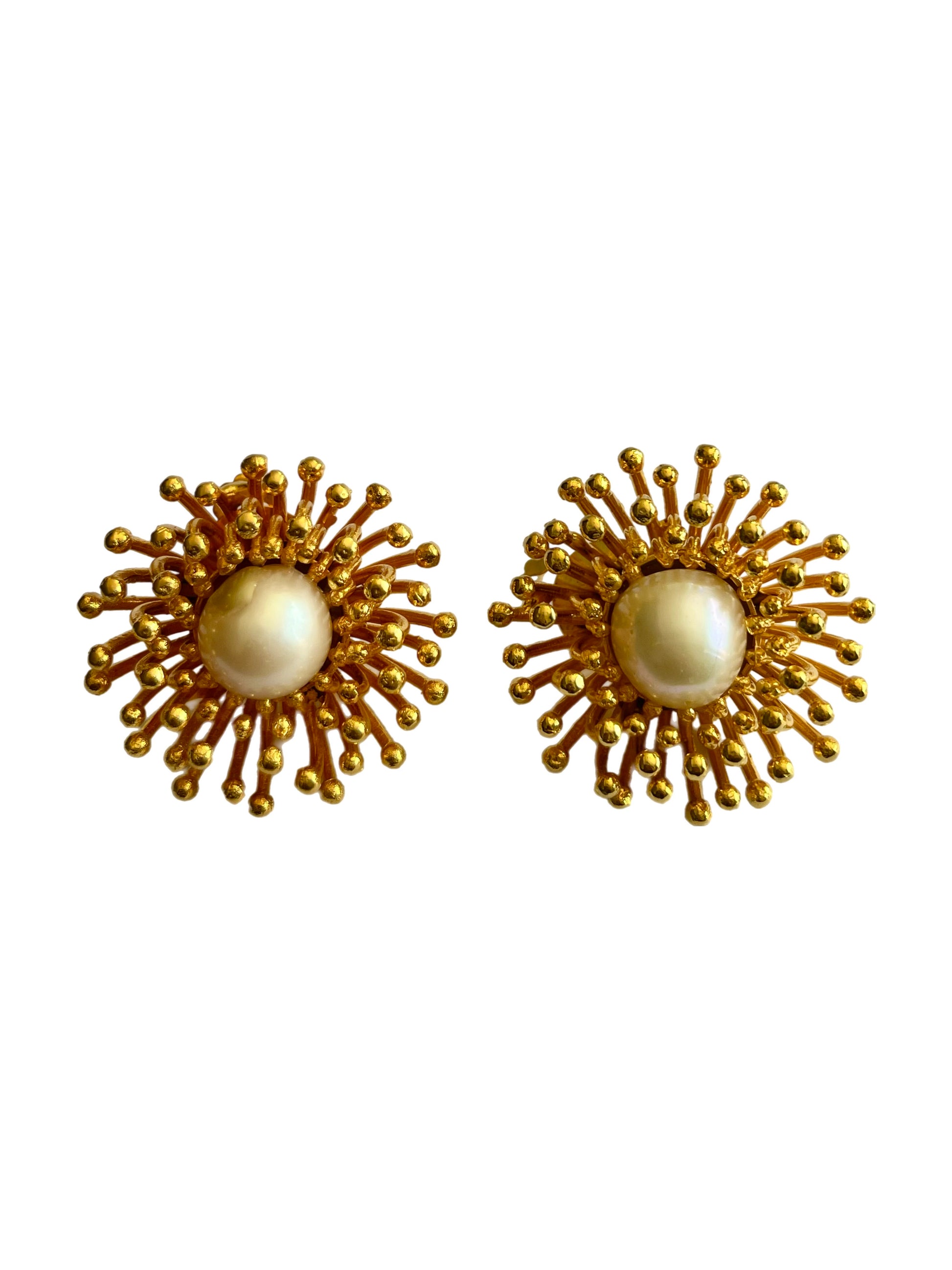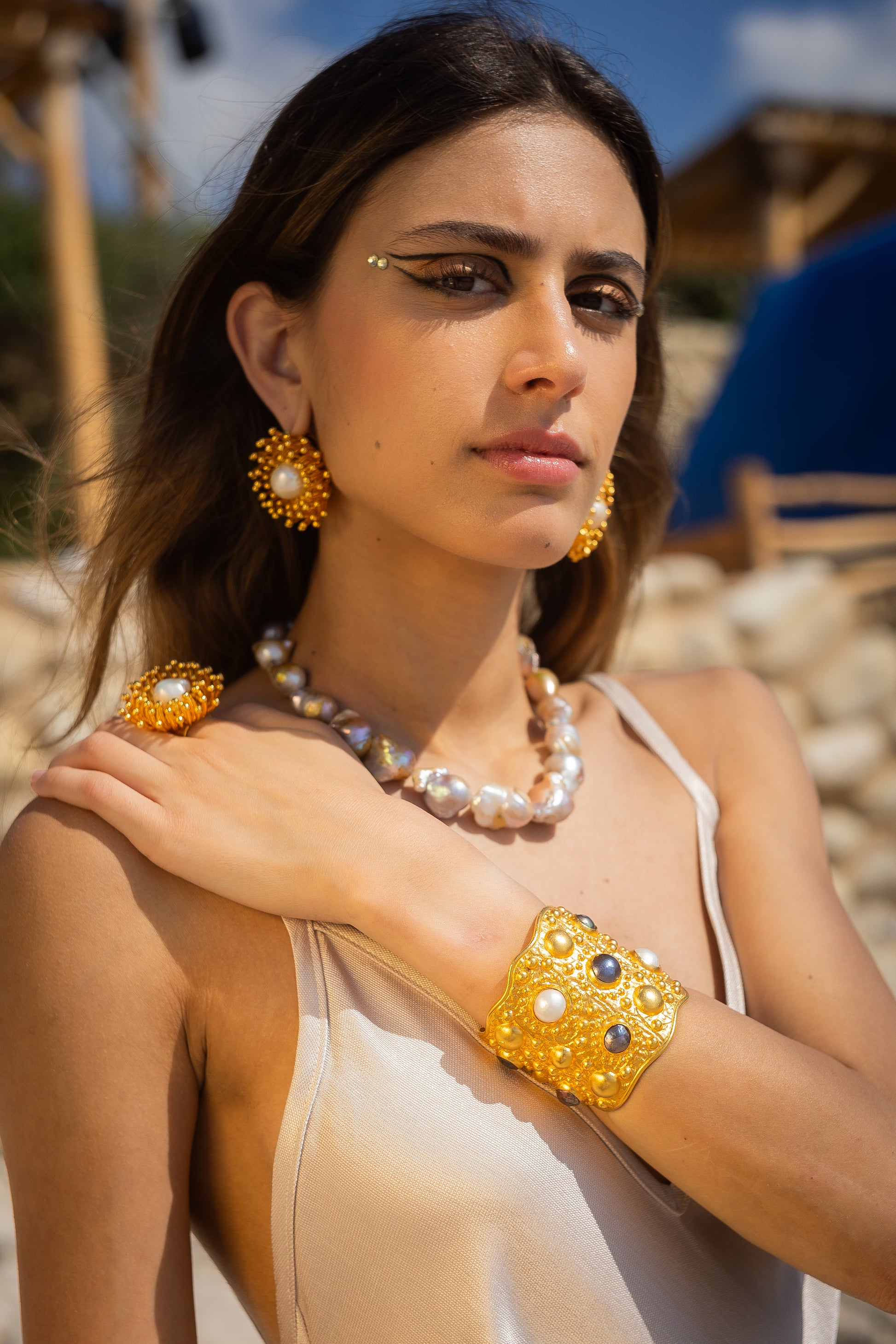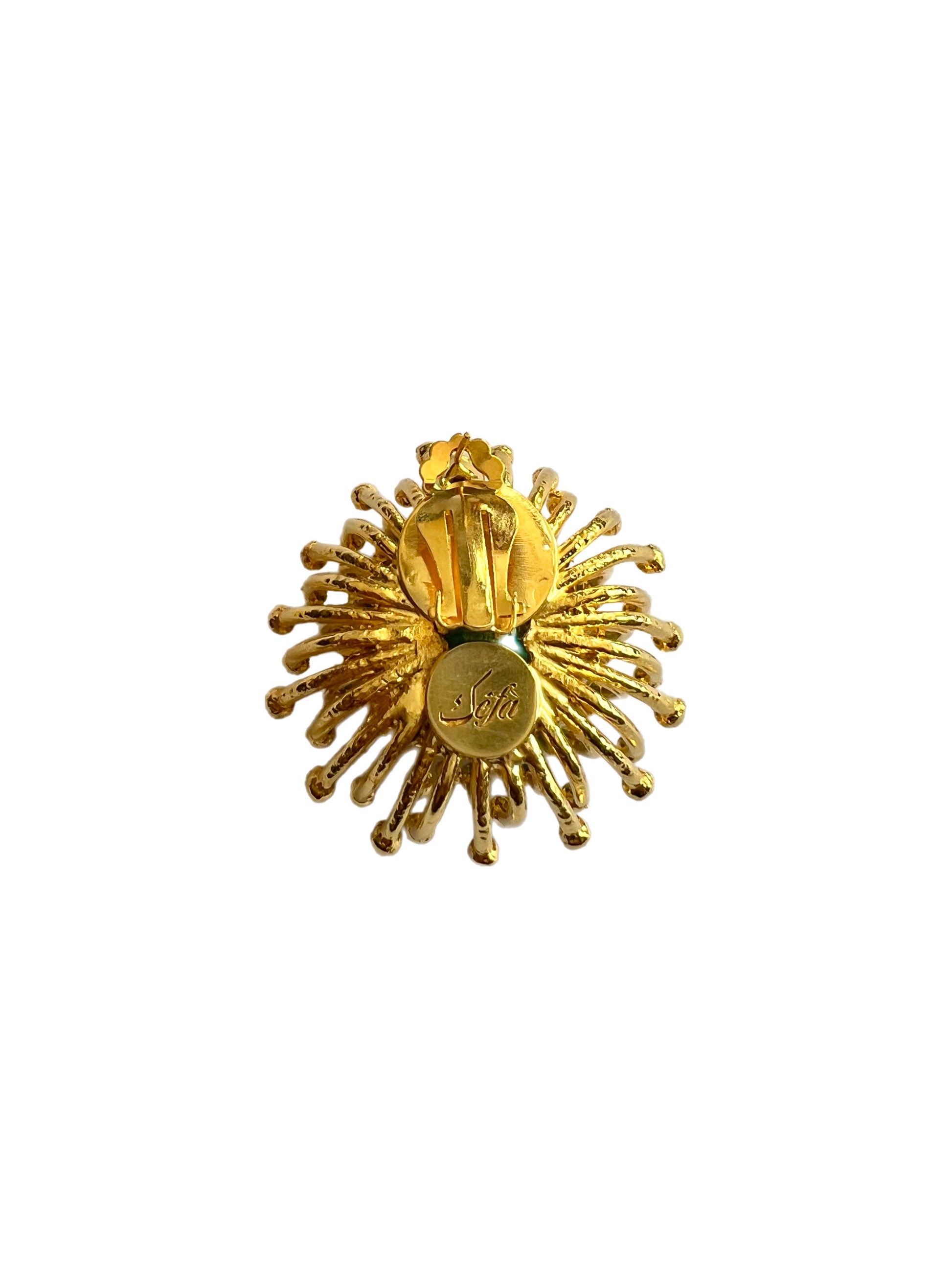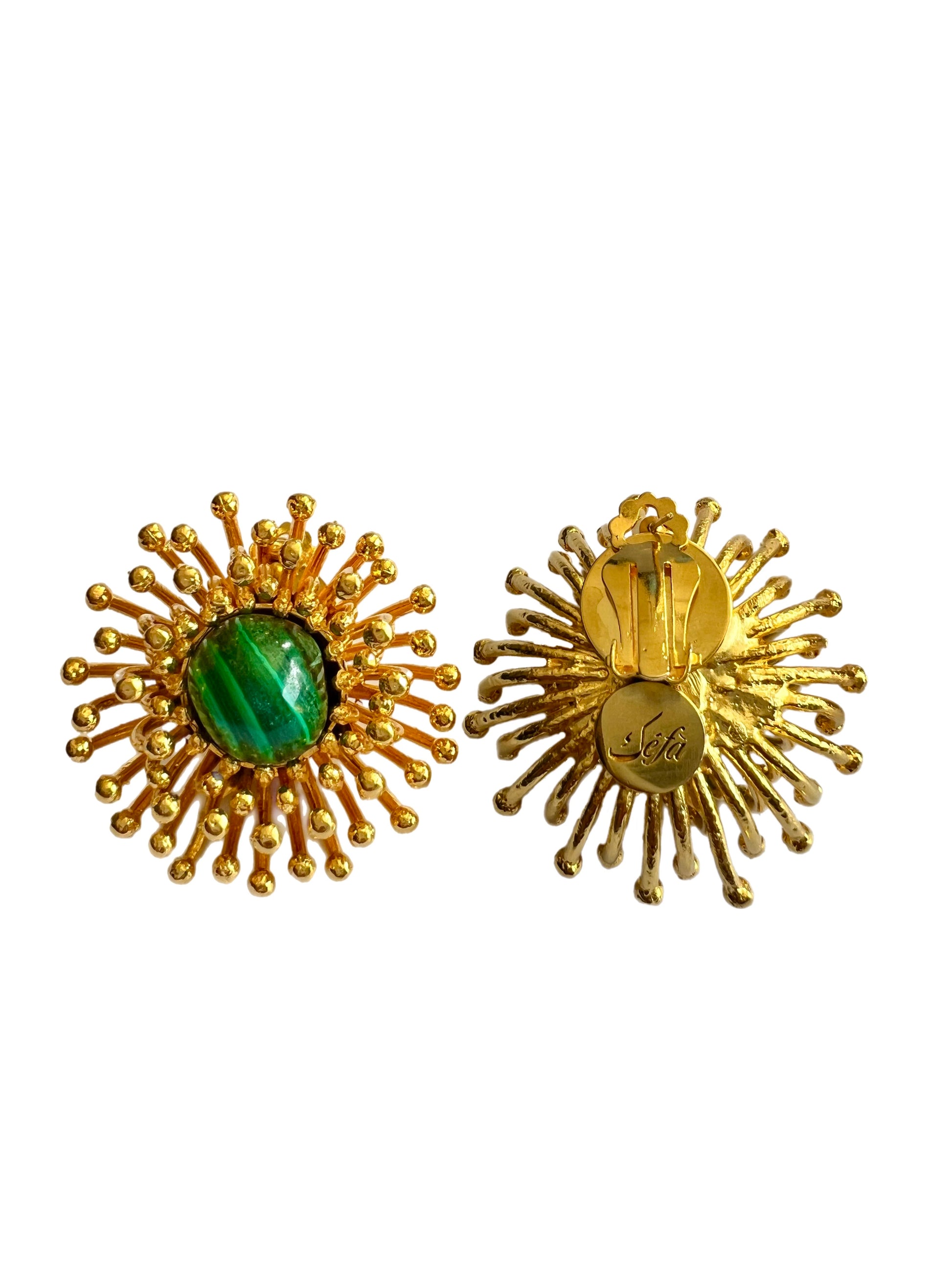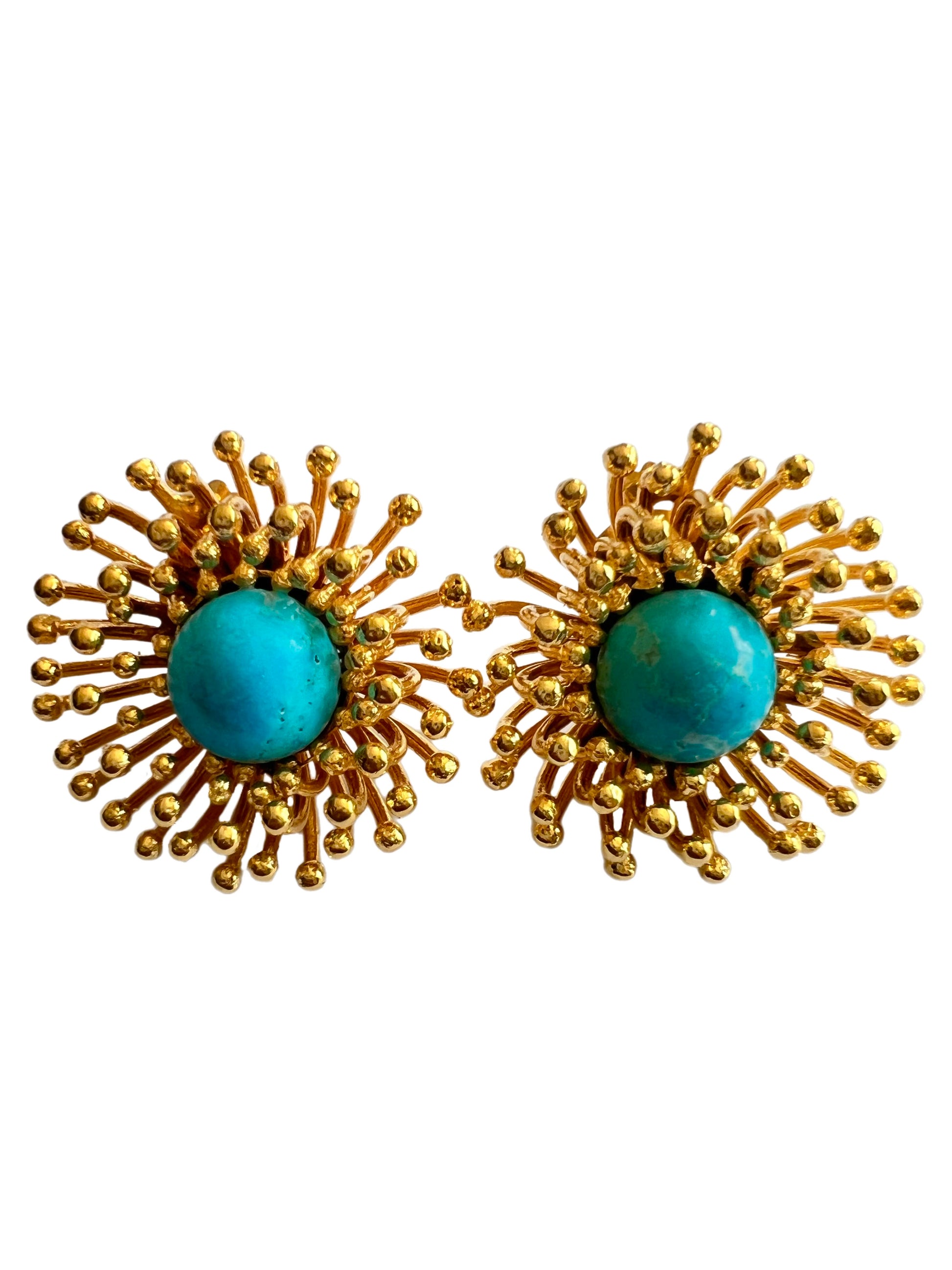 Introducing the Capucine Gold Plated Earrings, inspired by the delicate beauty of sea urchins. Adorned with a choice of turquoise, malachite, or pearl center stones, these earrings add a touch of coastal charm to any look.