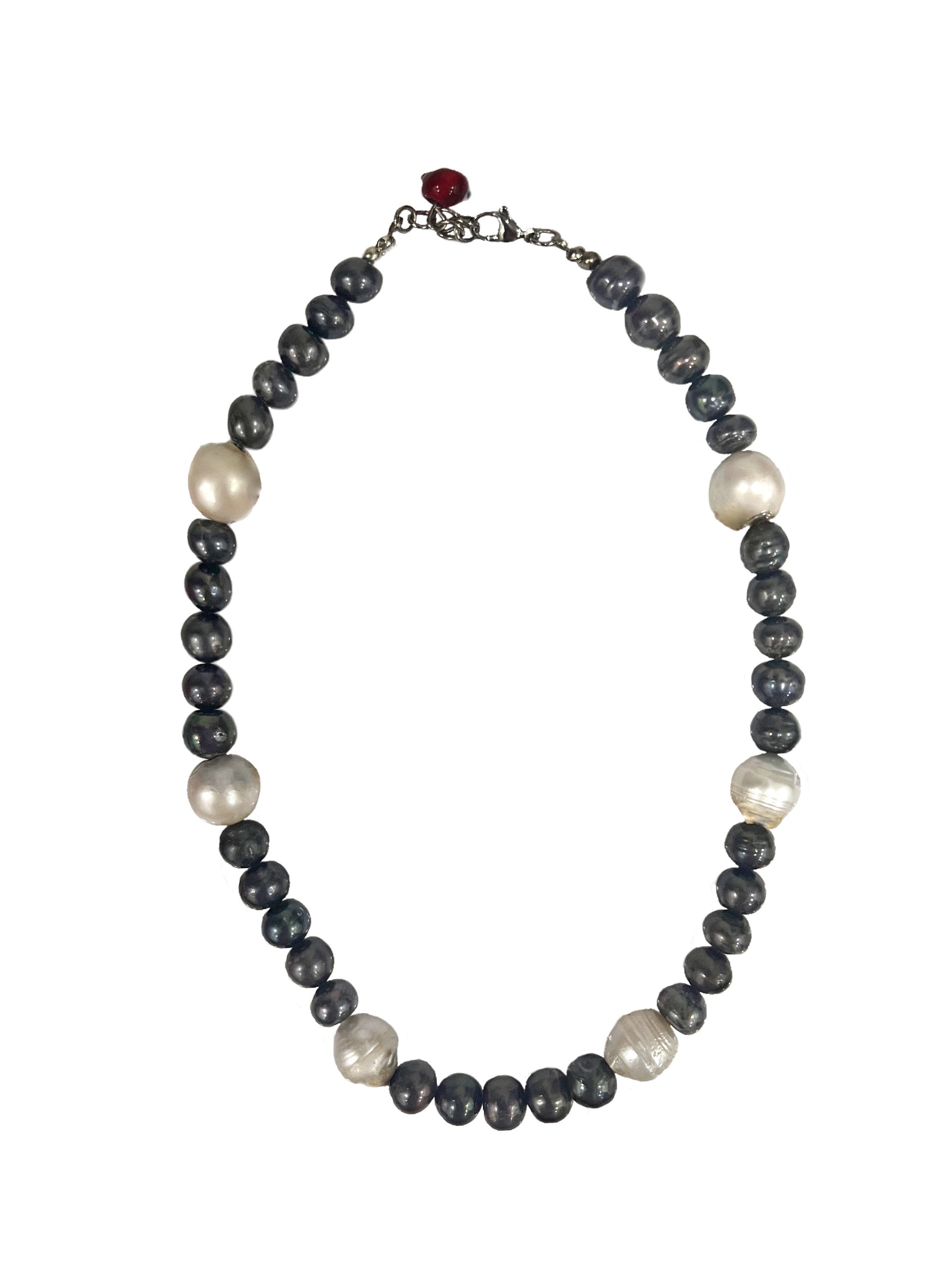 Corfu Necklace – a bold fusion of elegance featuring ringed black freshwater pearls and six white circle baroque pearls, all clasped together with a sleek silver closure.