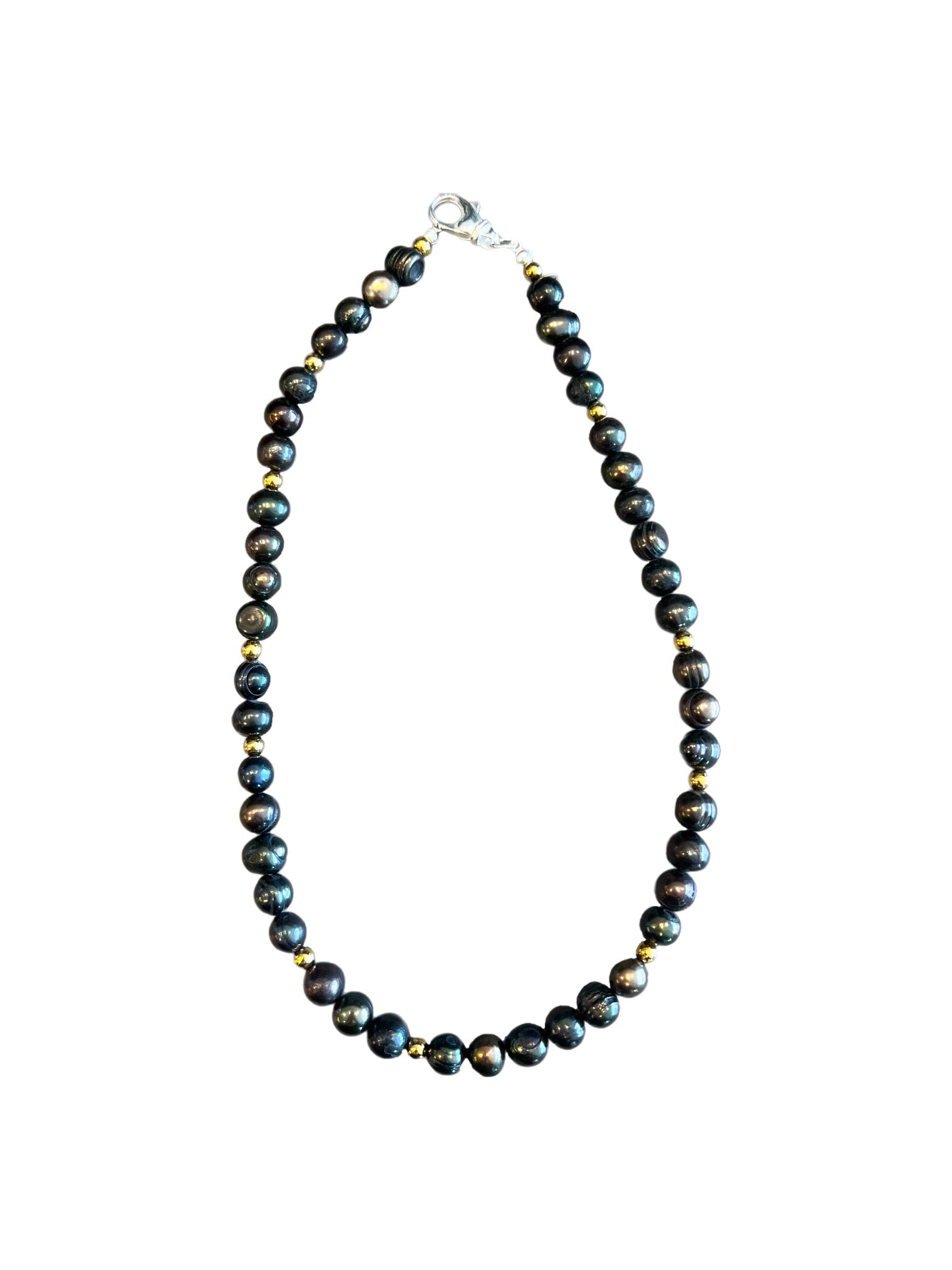 Ivy Necklace, an alluring composition of black pearls elegantly complemented by gold-plated beads. This chic accessory strikes the perfect balance between sophistication and modernity. Embrace the timeless combination of black and gold with the Ivy Necklace, a versatile piece that adds a touch of luxury to any ensemble.