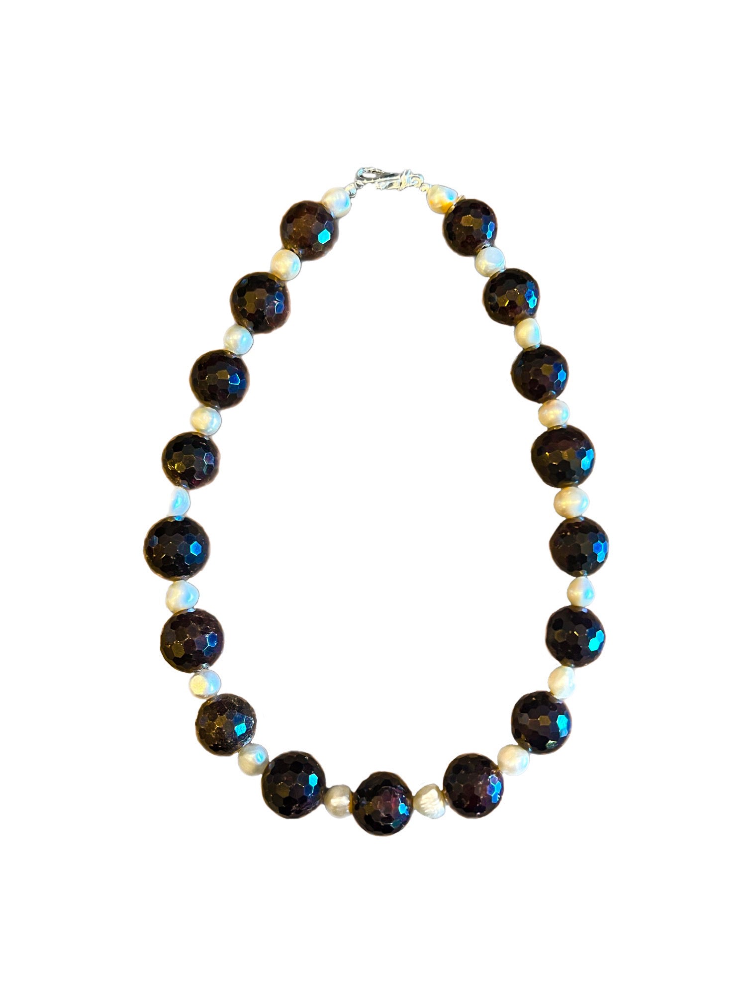 Lily Necklace, a graceful ensemble of luminous pearls accentuated by the presence of large, captivating garnets. This necklace combines the timeless charm of pearls with the bold allure of garnet, creating a piece that effortlessly elevates your style. Embrace the unique fusion of elegance and vibrancy with the Lily Necklace—a perfect addition to your collection of statement accessories.