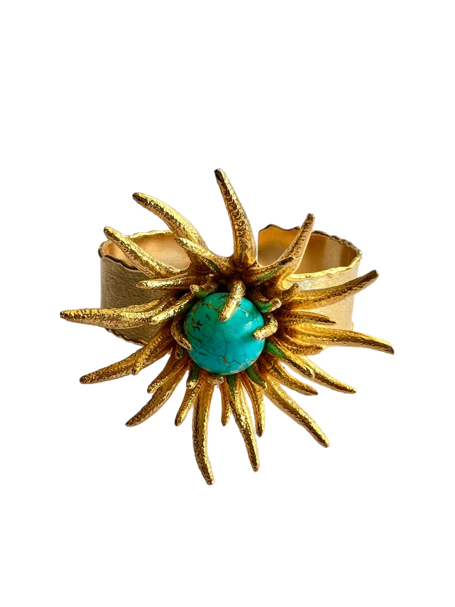 Brighten your look with the Meduse Gold Plated Bracelet, featuring a stunning "sun" centerpiece adorned with a turquoise stone. This beautiful accessory combines intricate design with a pop of color, perfect for any occasion. Whether dressing up or down, the Meduse Bracelet adds a touch of radiant elegance to your style.